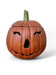 Vintage ceramic jack o' lanterns from the mid-20th century represent a shift from perishable carved turnips to durable, reusable holiday decor. This specific American-made style is highly collectible for its distinct smiling face and intricate glazed finish that captures a nostalgic, playful aesthetic.