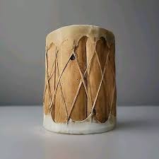 Drums hold deep spiritual and cultural significance for many Native American tribes, often used in ceremonies, dances, and storytelling. The specific design, materials, and decorations can vary greatly depending on the tribe and region. This particular style, featuring a log body and rawhide lacing, reflects traditional craftsmanship that has been passed down through generations, embodying a connection to nature and ancestral practices.