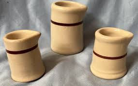 - Identify the specific tan base glaze paired with two parallel red horizontal bands around the body.