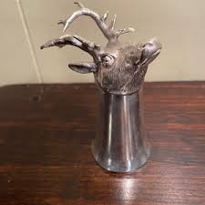 Stirrup cups originated in Britain and Europe as a parting drink offered to guests mounted on horseback before a hunt or journey. By the 18th and 19th centuries they became decorative collectibles, often made in silver, pewter or plated metals and topped with animal heads like stags, foxes or hounds to reflect hunting traditions. In the 20th century replicas and branded versions from fashion houses and silversmiths continued the motif, making stag-head stirrup cups popular as mantel or barroom display pieces.
