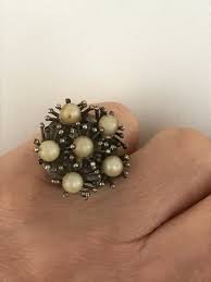 Pearl jewelry has been admired for centuries, symbolizing purity and elegance. In the mid-20th century, sterling silver settings became very popular for their versatility and affordability, making pearl rings accessible to a wider audience. This particular style, with its clustered design, reflects the decorative trends of the mid-century, often drawing inspiration from natural forms.
