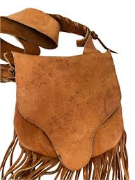 Fringe bags like this one gained immense popularity in the 1960s and 1970s, becoming an iconic accessory of the hippie and bohemian fashion movements. They reflected a free-spirited, counter-culture aesthetic, often handcrafted and celebrated for their natural materials and earthy tones. This style continues to be a timeless statement piece.